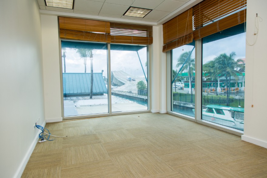 With 2,034 sf, this beautiful move in ready space features beige carpet and tile throughout. With views overlooking the Sir Sidney Poitier (incoming) Bridge and Marina Village, the large windows provide unbeatable natural light. This space has two private offices featuring glass partitions with frosted accents creating a modern feel. It also has a kitchenette and an open work area.